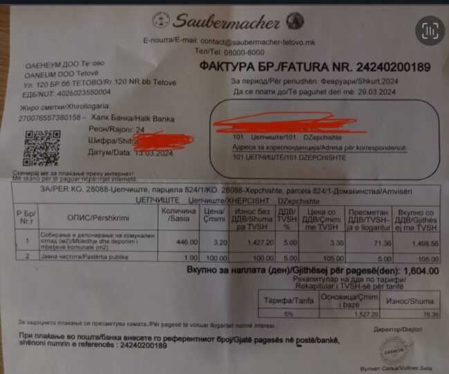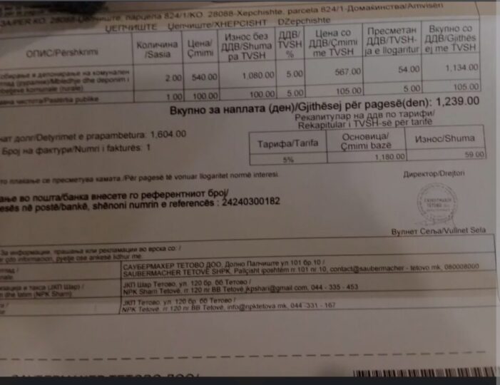 Ja edhe një fakt se fakturat e mbeturinave ende vijnë nga 1.200 denarë në Xhepçisht. Edhe përkundër faktit se në Këshill Komunal u votua vendosja e çmimit PAUSHALL prej 540 denarë për në fshatrat e Tetovës.