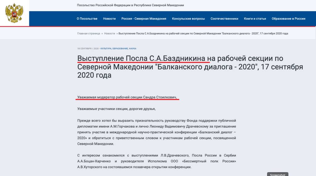 Siç mund ta shihni, Stoiljkovic ishte pjesë e “Dialogut Ballkanik” 2020, të cilin e ndau edhe Ambasada e Federatës Ruse në Maqedoni, në të njëjtën ngjarje foli edhe ambasadori Sergej Bazdnikin.