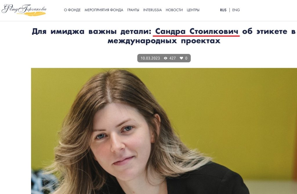 Sandra Stoiljkovic merr pjesë edhe në “Balkan Dialogue”, një aktivitet që Fondacioni organizon çdo vit në një vend të ndryshëm nga Ballkani, ku theksohen lidhjet e vendeve të Ballkanit me Federatën Ruse, dhe në të njëjtën kohë, praktikisht rekrutohet staf. i cili do të vazhdojë të përhapë propagandën ruse në Ballkan (pasi u gjet dhe u punësua edhe Sandra Stoiljkovic).