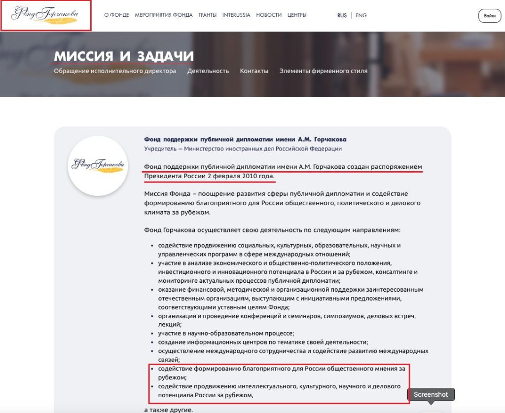 Misioni i Fondacionit është të inkurajojë zhvillimin në fushën e diplomacisë publike dhe të promovojë krijimin e një klime të favorshme sociale,politike dhe biznesi për Rusinë jashtë vendit.
