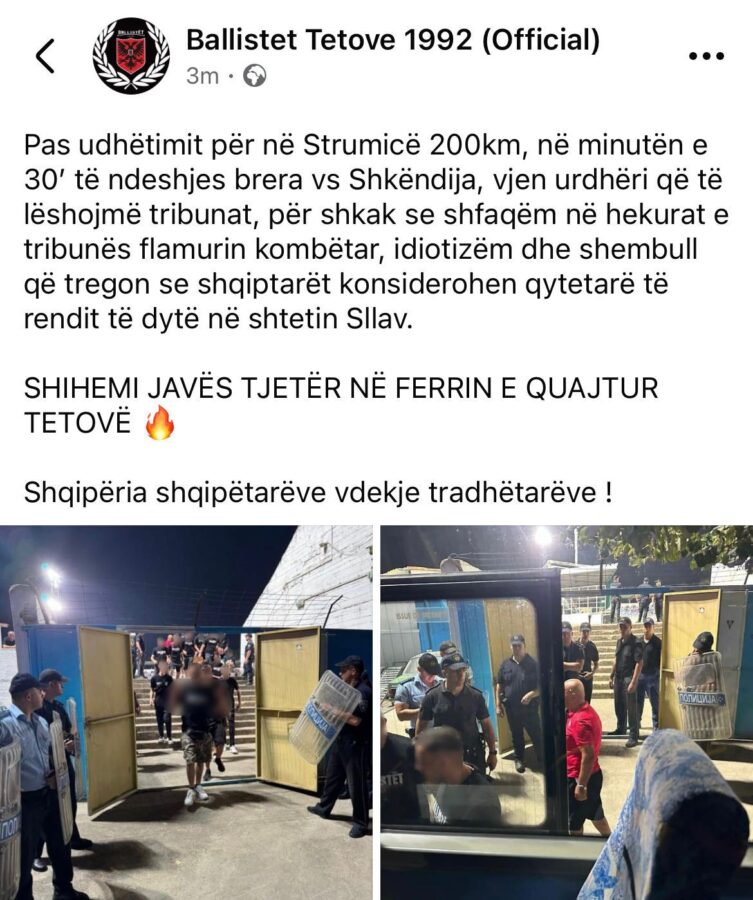 “Pas udhëtimit për në Strumicë 200km, në minutën e 30’ të ndeshjes brera vs Shkëndija, vjen urdhëri që të lëshojmë tribunat, për shkak se shfaqëm në hekurat e tribunës flamurin kombëtar, idiotizëm dhe shembull që tregon se shqiptarët konsiderohen qytetarë të rendit të dytë në shtetin Sllav. SHIHEMI JAVËS TJETËR NË FERRIN E QUAJTUR TETOVË 🔥 Shqipëria shqipëtarëve vdekje tradhëtarëve !”, thonë Ballistët.